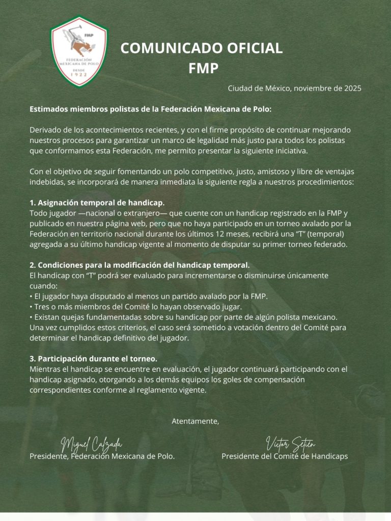 Todo jugador —nacional o extranjero— que cuente con un handicap registrado en la FMP y publicado en nuestra página web, pero que no haya participado en un torneo avalado por la Federación en territorio nacional durante los últimos 12 meses, recibirá una “T” (temporal) agregada a su último handicap vigente al momento de disputar su primer torneo federado.