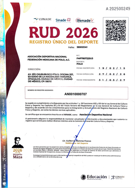 La Federación Mexicana de Polo (FMP) informa a la comunidad polista del país que ha recibido oficialmente el Registro Único del Deporte (RUD) 2026, otorgado por la Comisión Nacional de Cultura Física y Deporte (CONADE).