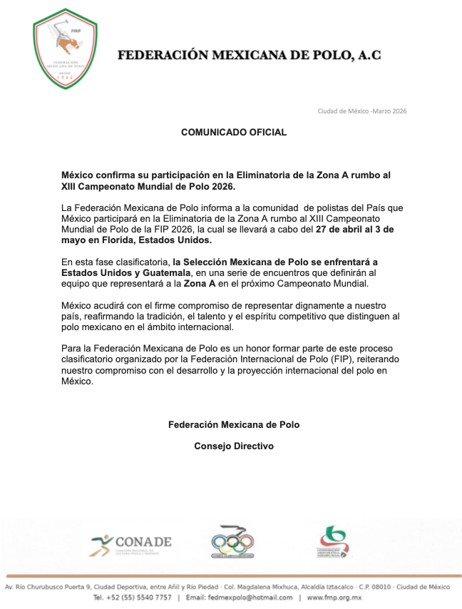 La Federación Mexicana de Polo informa a la comunidad de polistas del País que México participará en la Eliminatoria de la Zona A rumbo al XIII Campeonato Mundial de Polo de la FIP 2026, la cual se llevará a cabo del 27 de abril al 3 de mayo en Florida, Estados Unidos.